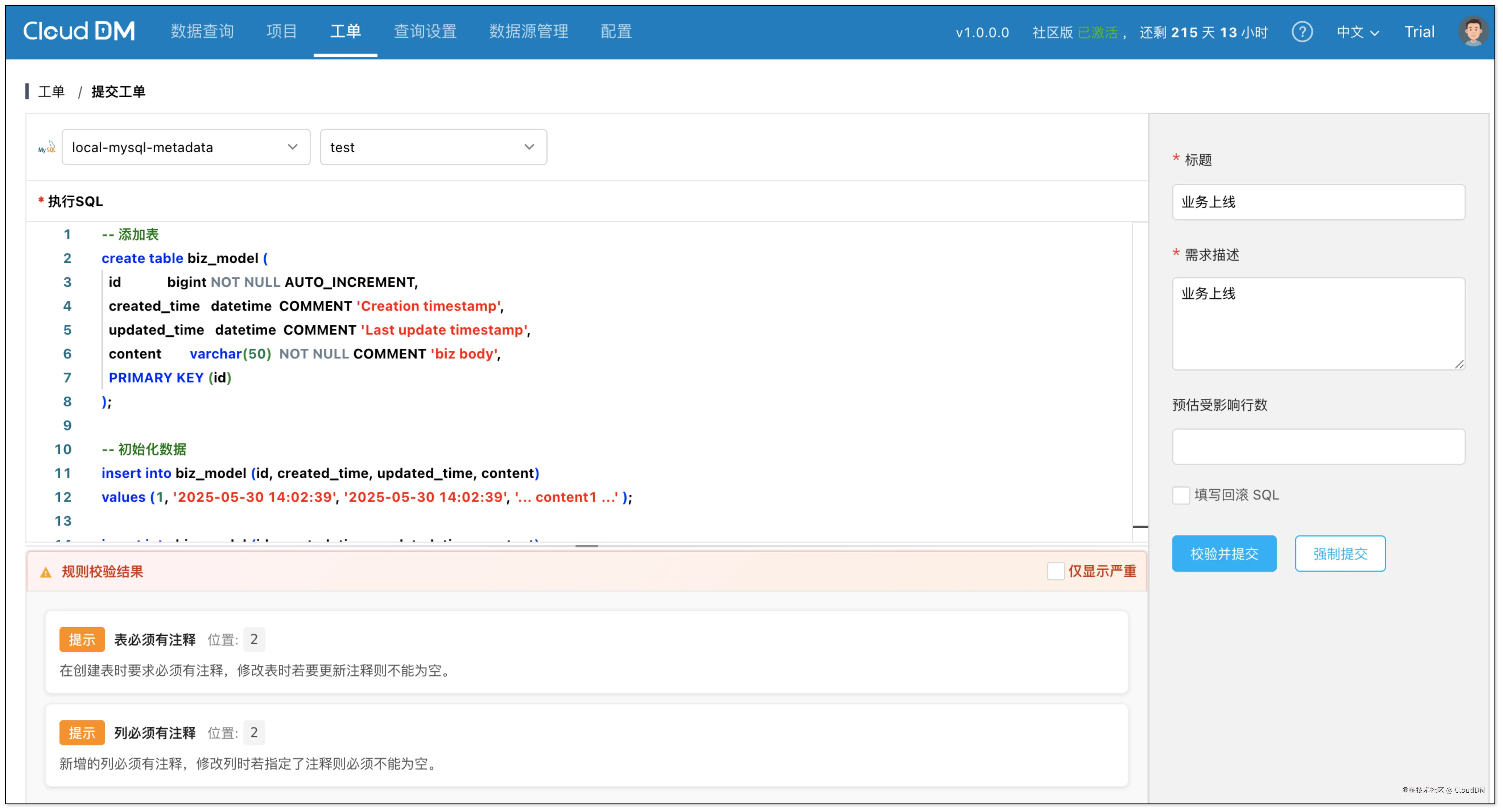 在对工单进行 SQL 审核时,CloudDM 提供了两个安全级别。如果 SQL 命中了等级较高的 阻塞 级,就不能创建工单,只有 提示 级时可以选择强制递交工单。