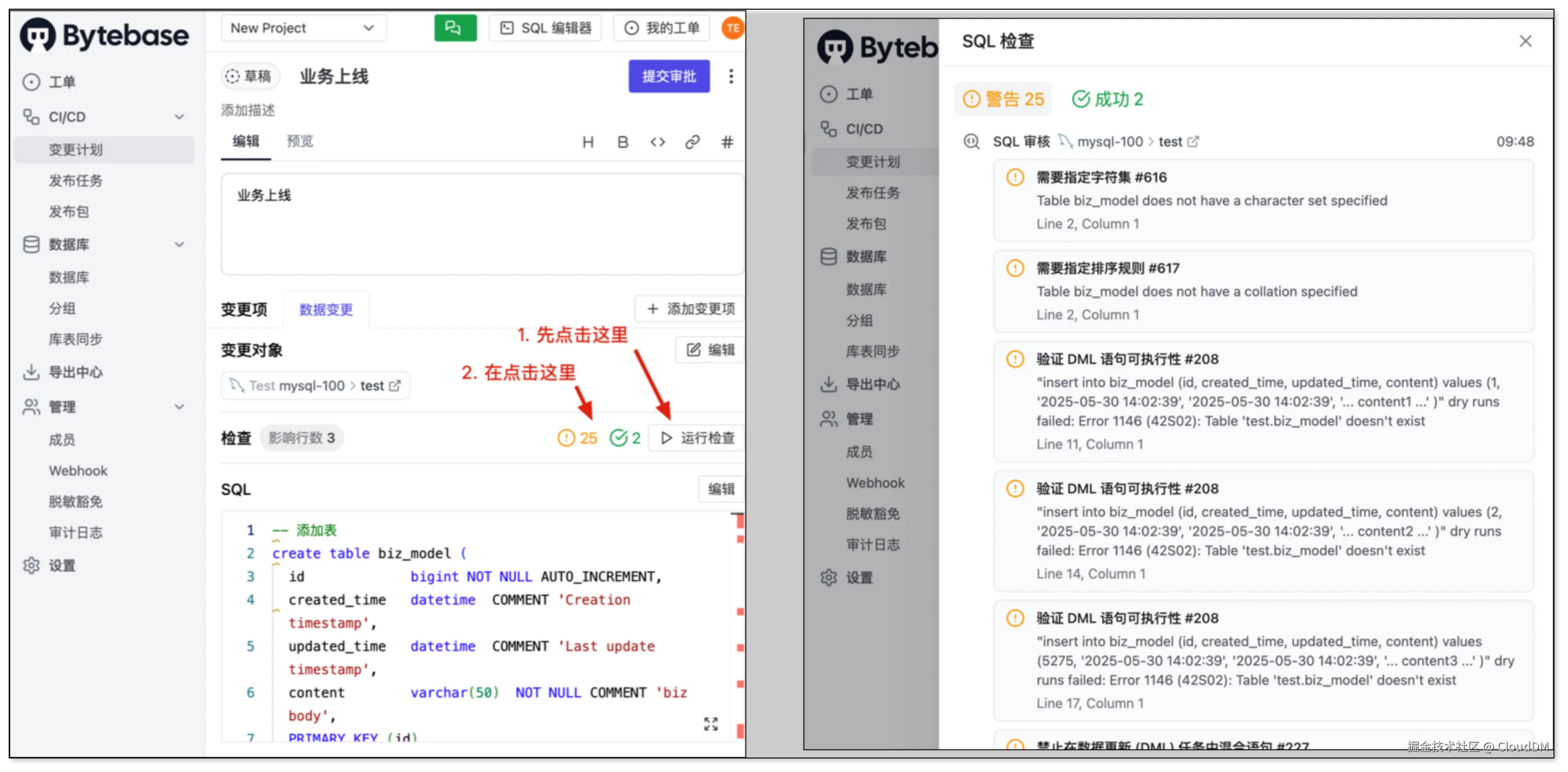 Bytebase 在递交工单时可以手动对 SQL 进行检查,需要先 “运行检查”,再点击“检查结果图标”,方可查看检查结果,结果中会显示问题 SQL 所在行。