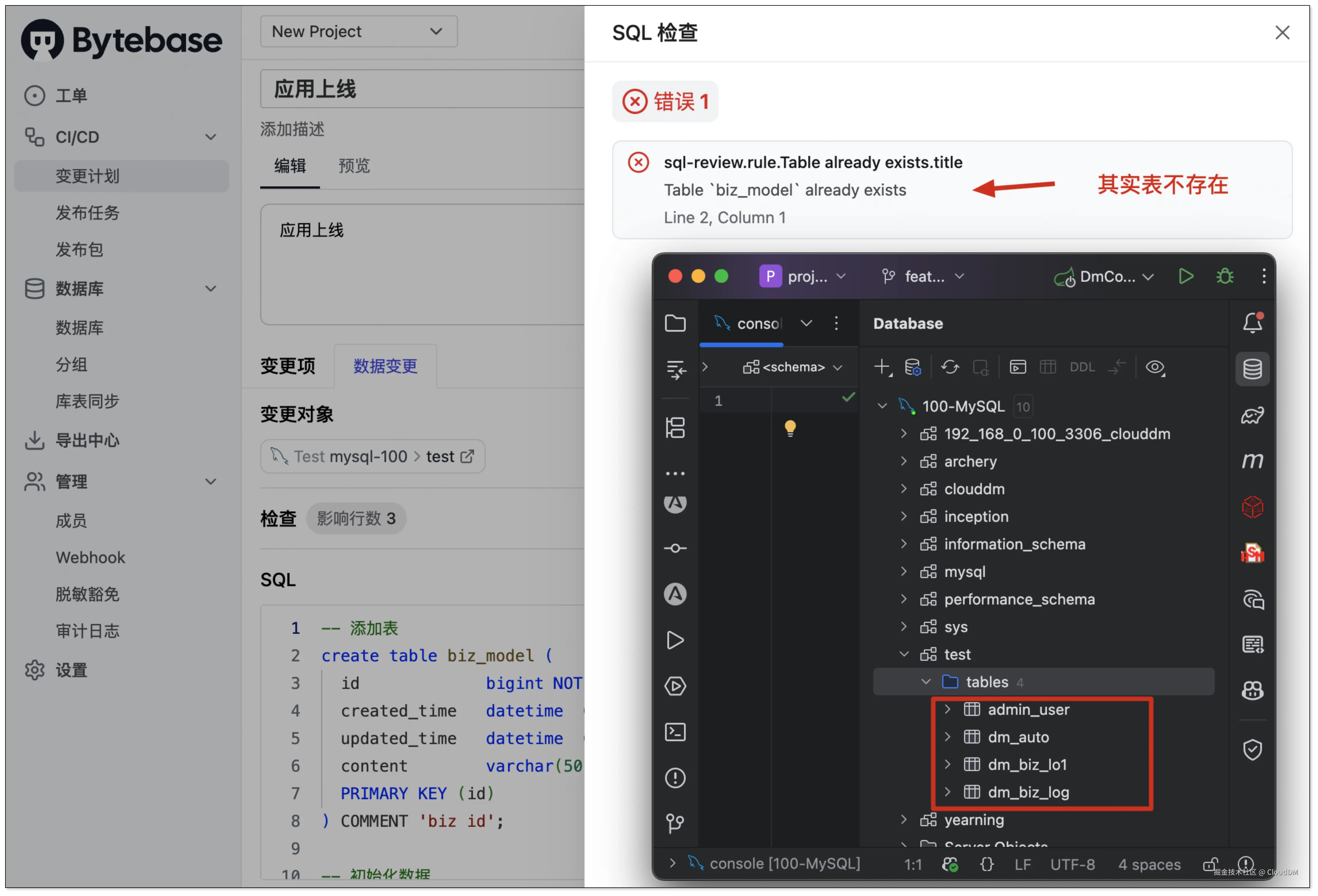 需要注意的是,Bytebase 在进行 SQL 检测时使用自身存储的元信息数据。若在产品之外执行了 DDL 语句,会导致其内部存储的元信息和真实数据库不一致,这种不一致会进一步影响 Bytebase 功能可用性,例如 SQL 在检测环节出现幻觉。