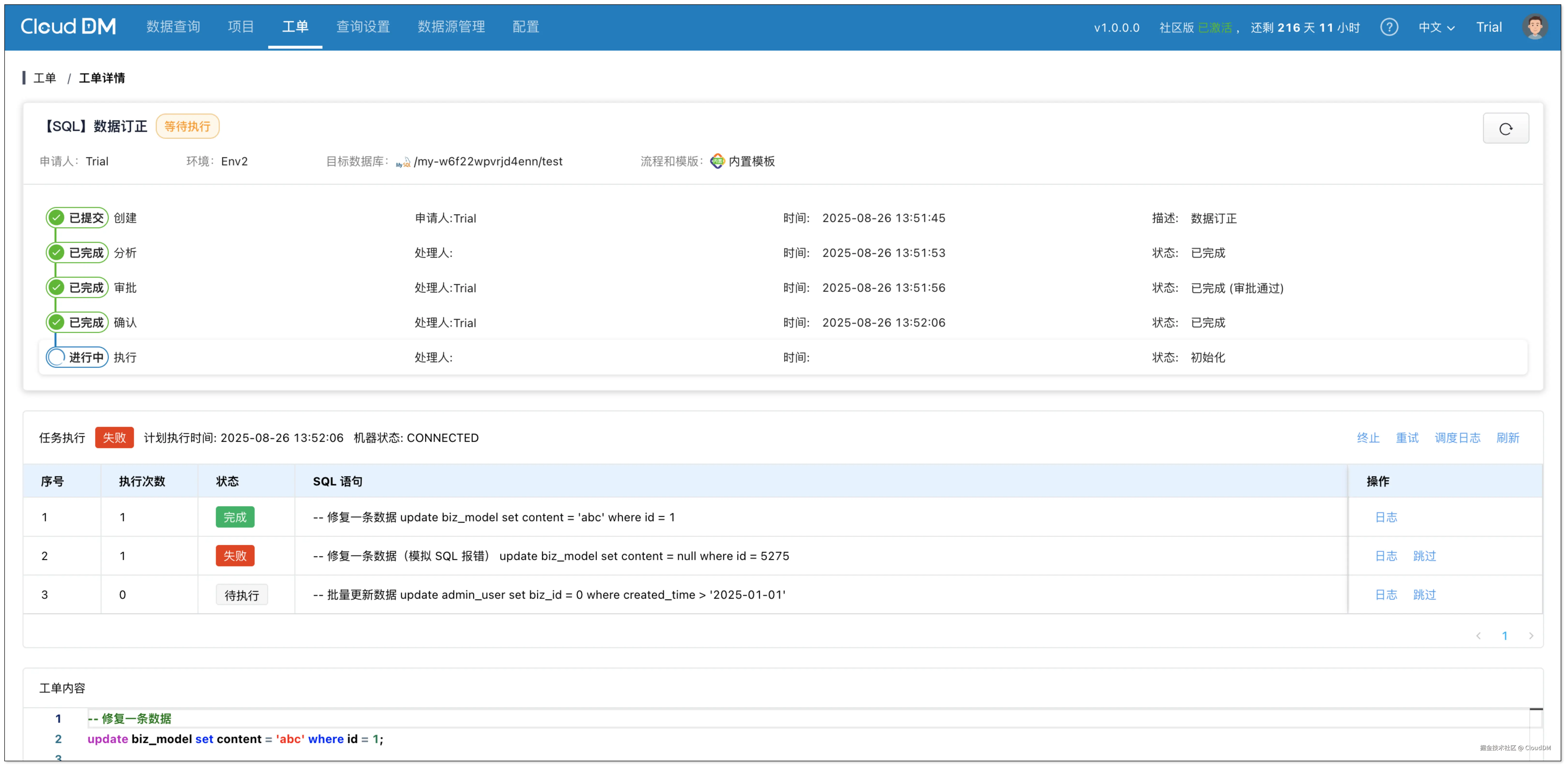 CloudDM 支持工单调试功能,在“数据订正”场景里,即使遇到预设的报错,也可以人工介入处理,再继续执行后续 SQL,而不是简单地中断执行。