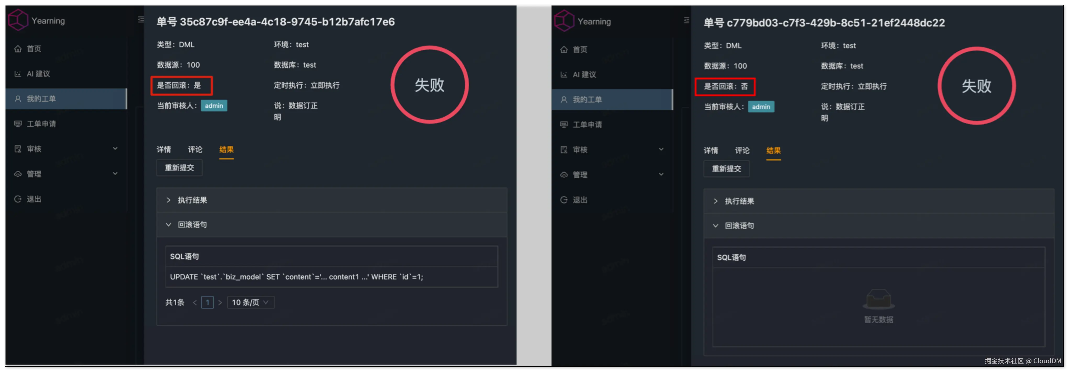 在“数据订正”场景中,Yearning 能在预设的报错语句处成功中止执行。但它不支持报错后的后续处理,如果是一批需要一对一更新的数据,遇到报错后只能新建工单来继续执行剩余 SQL。