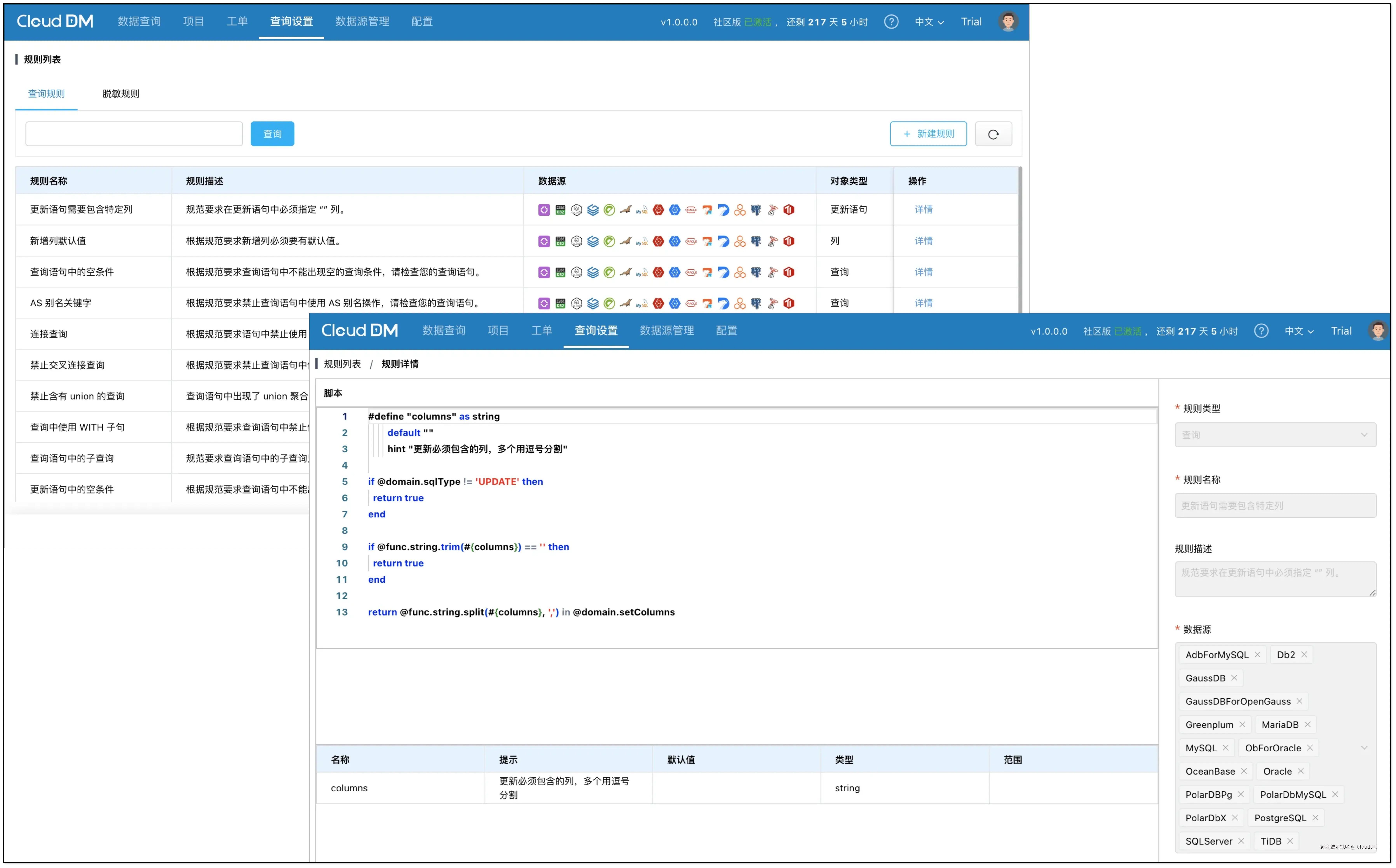 CloudDM 内置了 60 多条规则,并且基本适用于支持的 18 种数据源。比较极客的是,CloudDM 的所有规则全部使用特定的 DSL 语言来编写,并且支持自定义新的规则。这意味着除了内置规则之外,还可以根据自己特殊需要使用 DSL 编写个性化规则,免去二次开发的烦恼。
