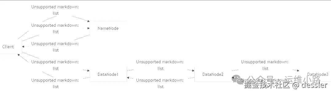 客户端与第一个DataNode(DN1)建立连接,DN1再连接DN2,DN2连接DN3,形成数据写入管道(Pipeline)。
