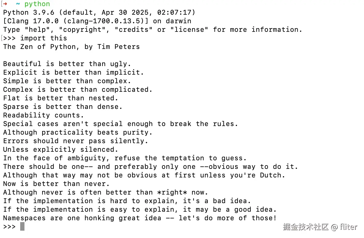 当你在Python解释器中输入import this时,你会看到19条解释Python设计哲学的格言。