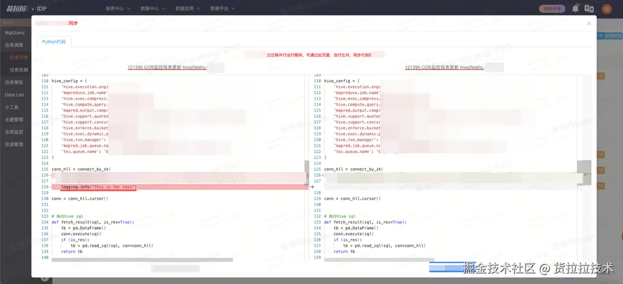 - 代码一致性:为保证计算任务代码、数据、元数据一致,数据平台研发了自动同步功能,用户在主环境修改的数据和计算任务,能自动同步到备环境,减少了双跑期间用户维护代码的复杂度,保证了主备环境代码的一致性。