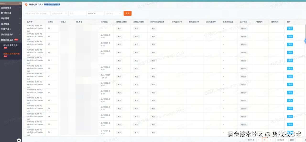 存量数据迁移完成(每日仍在迁移增量数据)、抽数任务全量打开后,新环境开始“蓄水”了。此时开始进入链路双跑期,新链路的数据每天会调度产出,数据验证的考验接踵而至:怎么验证涉及公司近 20 个部门、数万张Hive表的数据和主环境是否一致?