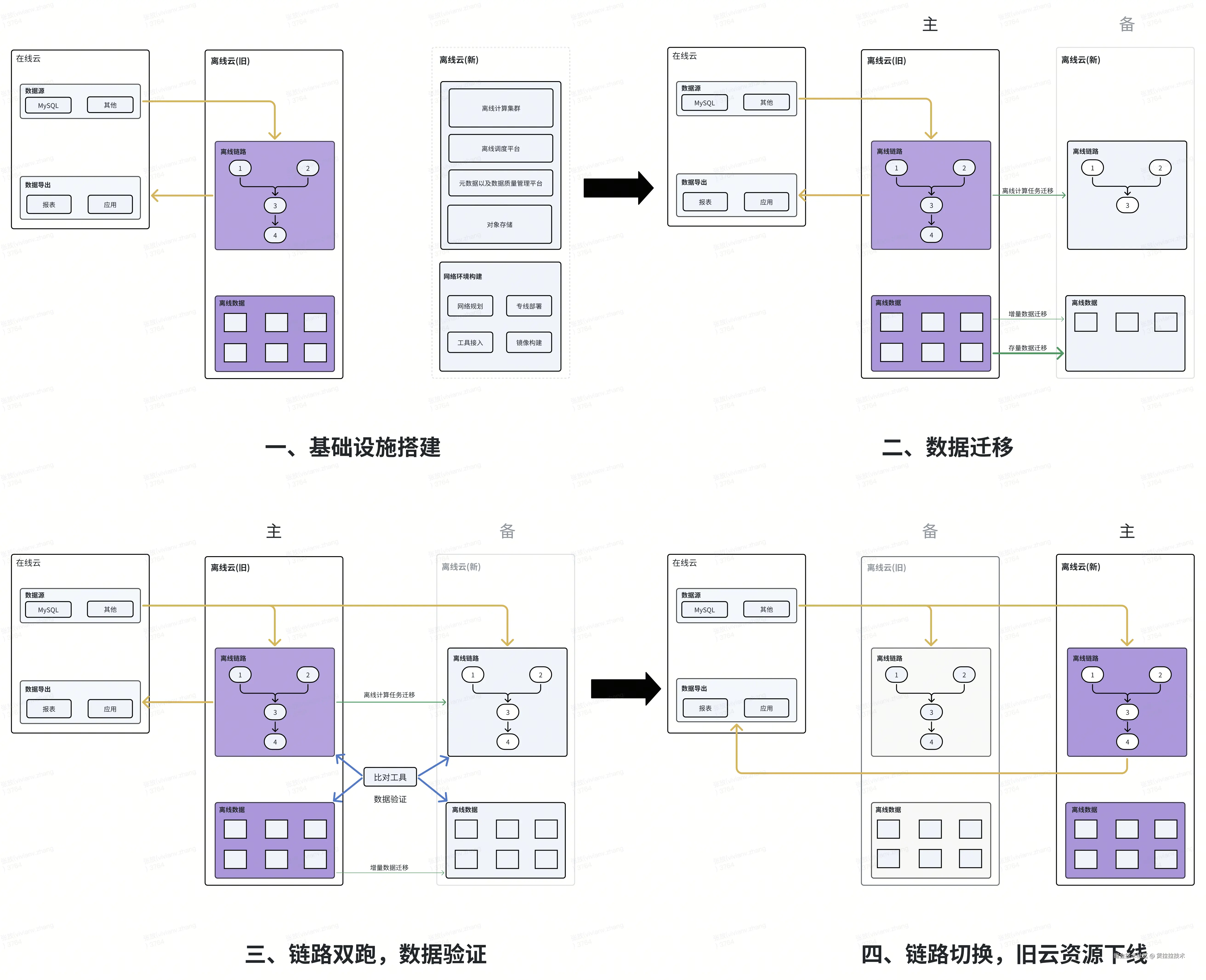 - 链路切换、资源下线:数据质量验收通过之后,新云链路切主,旧云链路变为备链路(具备可回滚条件)。新云环境运行稳定、历史数据无质量问题之后,下线旧云链路以及资源。