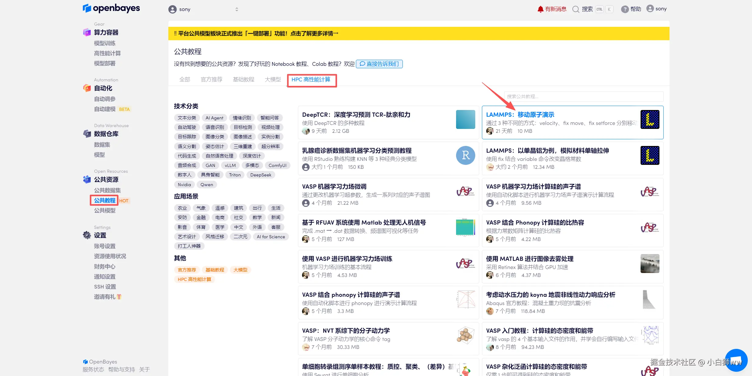 登录 OpenBayes.com,在「公共教程」页面,点击「HPC 高性能计算」栏目,选择「LAMMPS:移动原子演示」教程。