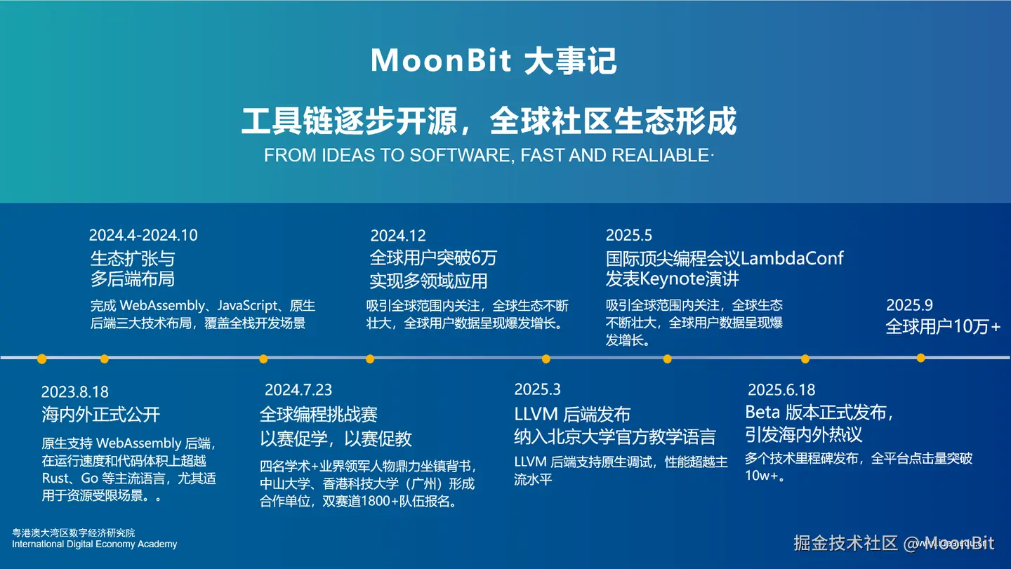 带着这样的信念,MoonBit 踏上了这条看似孤独,却至关重要的道路。三年过去,从语言设计到编译器优化,从多后端支持到 IDE 与工具链建设,再到包管理平台与生态搭建,MoonBit 已经走过了从 Alpha 到 Beta 的关键历程。如今,它不仅成为国内首个工业级编程语言,也逐渐走进国内大学课堂、实验室和全球开源社区。