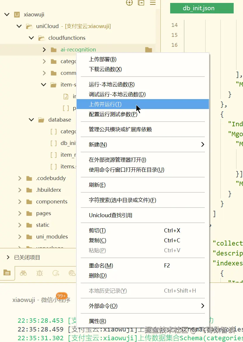 上传并运行云函数。在 HBuilderX 中的 uniCloud - cloudfunctions 下的一个个云函数文件夹上右键。