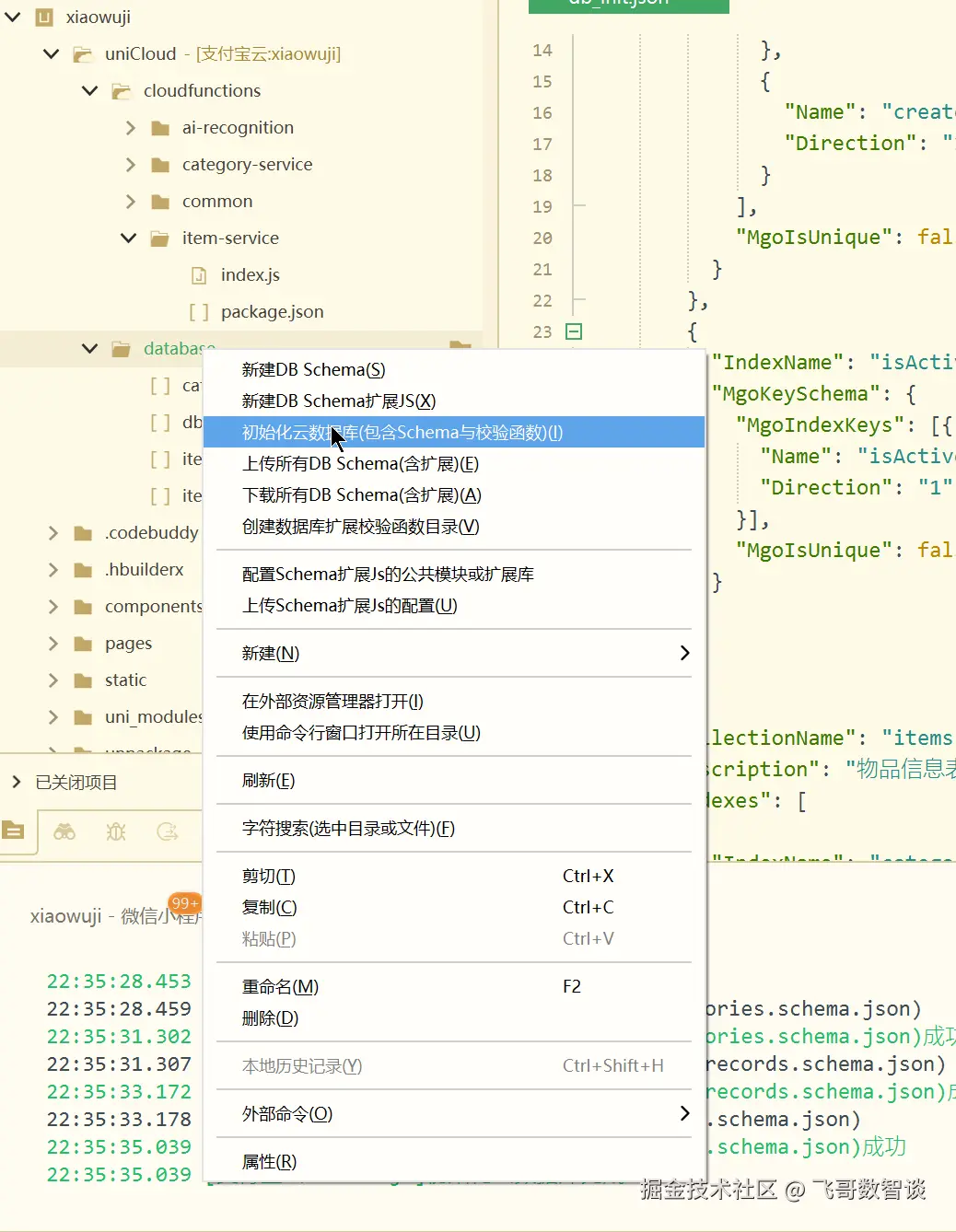 初始化数据库。在 HBuilderX 中的 uniCloud - database 文件夹上右键。