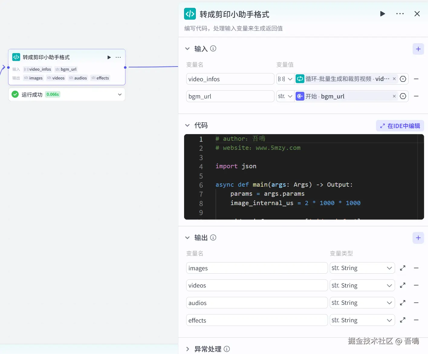 这个节点使用到了扣子官方的【代码】节点,用于把视频、图片、背景音乐等转成视频合成插件需要使用到的时间线数据格式。