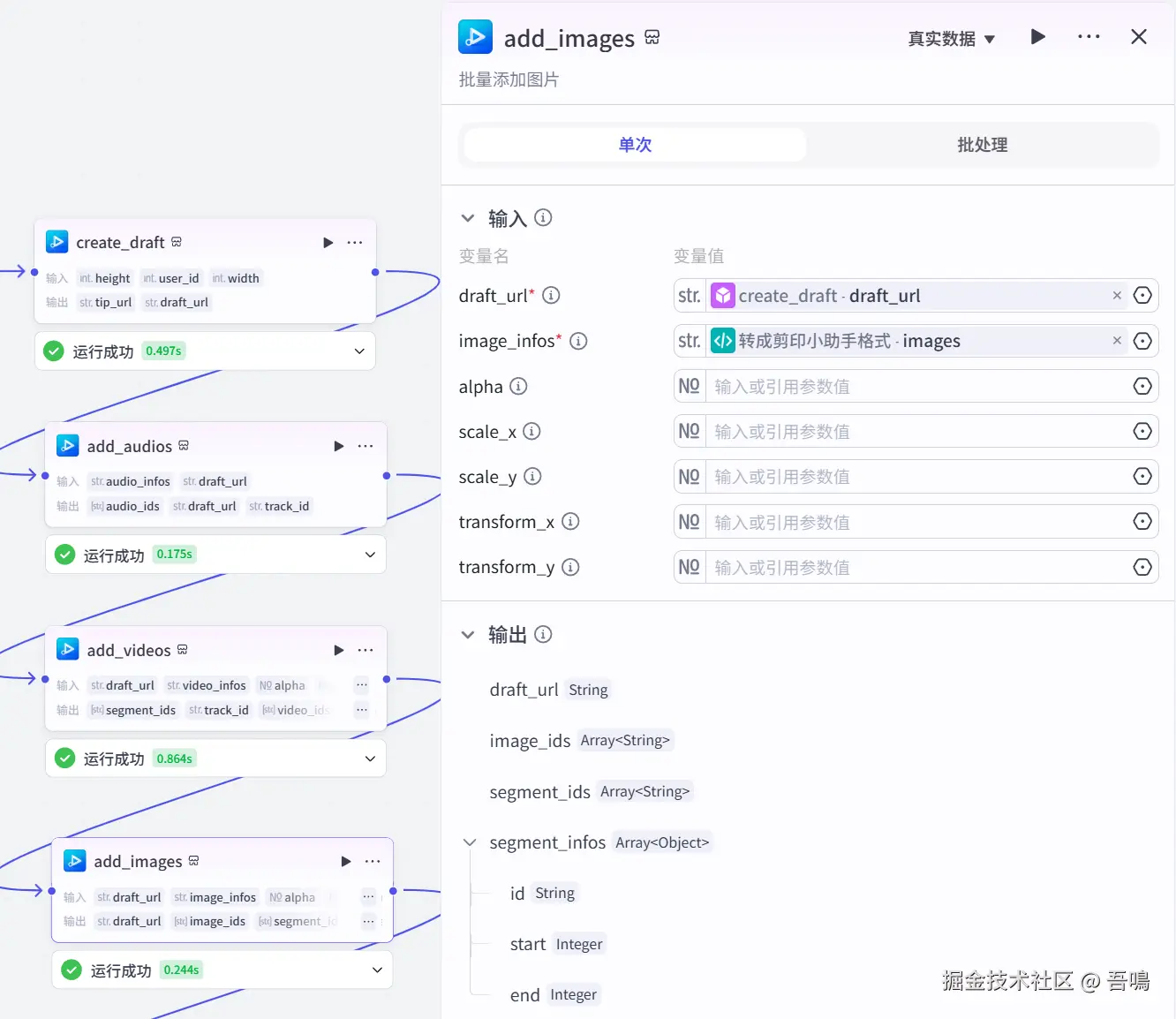 这个节点使用到了扣子第三方插件【视频合成_剪映小助手】的【add_images】工具。