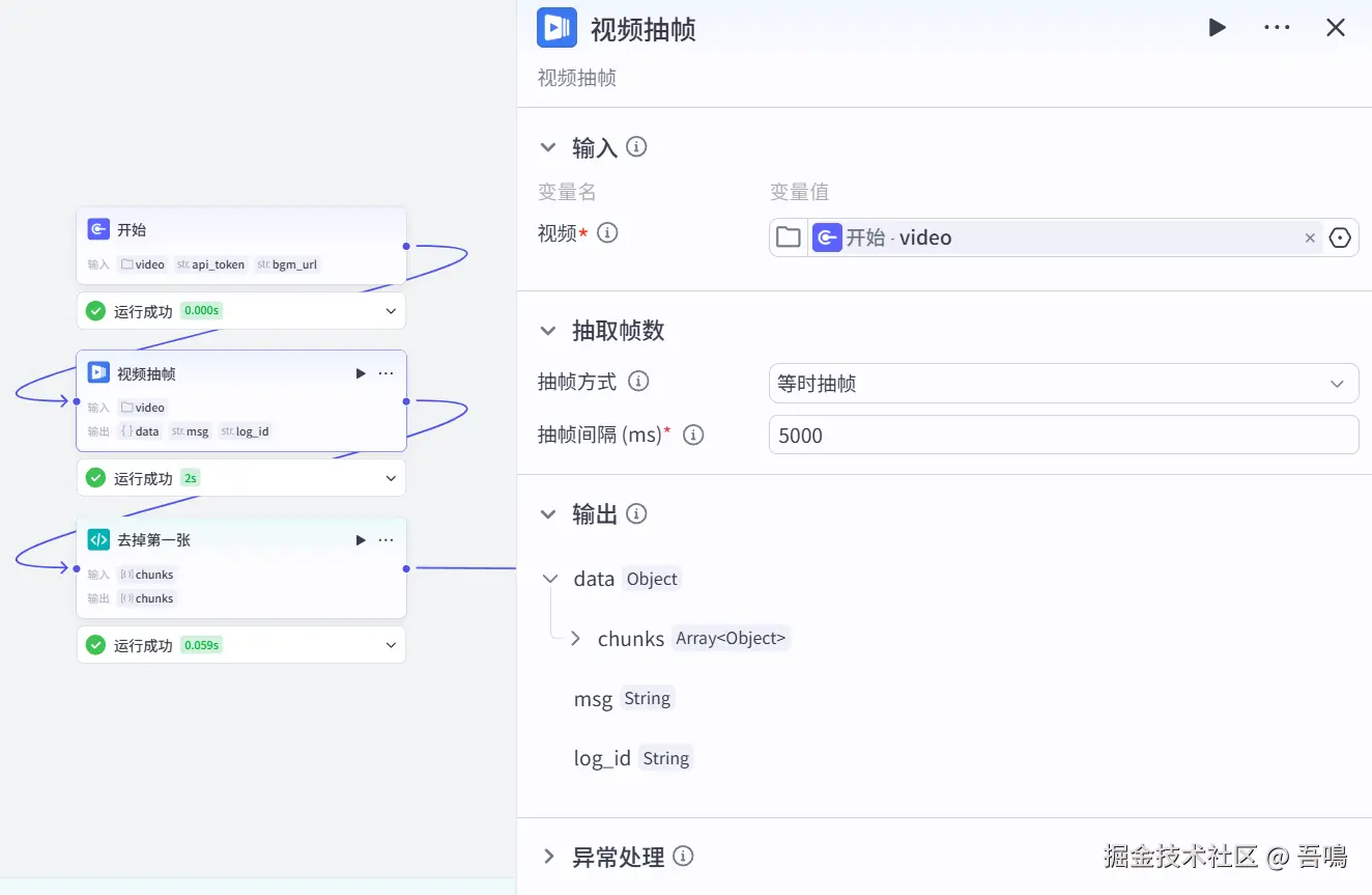 这个节点使用到了扣子官方的【视频抽帧】节点,这里我选择【等时抽帧】,每5秒抽取一帧。