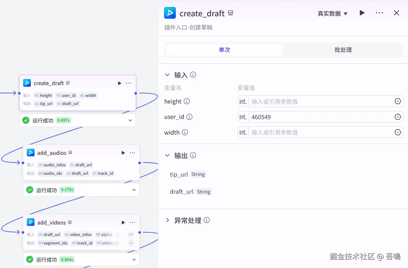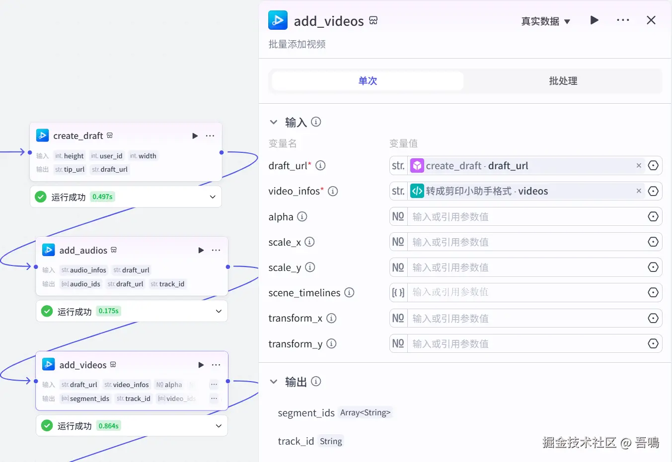 这个节点使用到了扣子第三方插件【视频合成_剪映小助手】的【add_videos】工具。