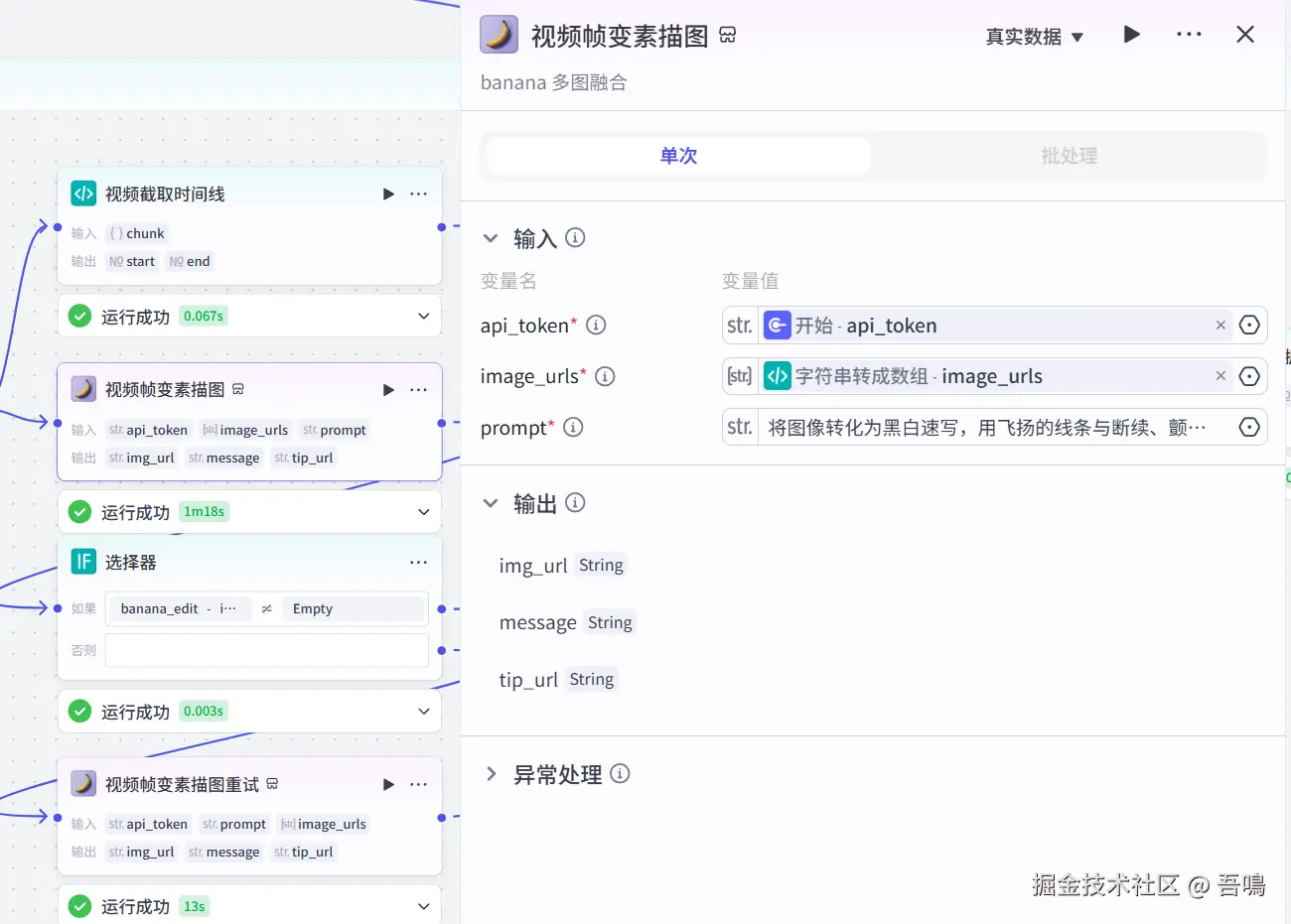 这里使用到了扣子的第三方插件【香蕉多图融合】的【banana_edit】工具,用于生成视频帧对应漫画图。这一部分,因nano banana的接口不太稳定,因此做了一次重试。