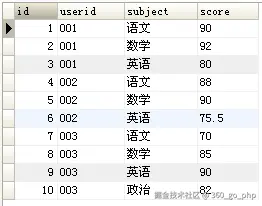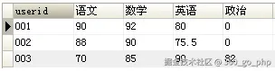 注意,SUM() 是为了能够使用GROUP BY根据userid进行分组,因为每一个userid对应的subject="语文"的记录只有一条,所以SUM() 的值就等于对应那一条记录的score的值。假如userid ='001' and subject='语文' 的记录有两条,则此时SUM() 的值将会是这两条记录的和,同理,使用Max()的值将会是这两条记录里面值最大的一个。但是正常情况下,一个user对应一个subject只有一个分数,因此可以使用SUM()、MAX()、MIN()、AVG()等聚合函数都可以达到行转列的效果。