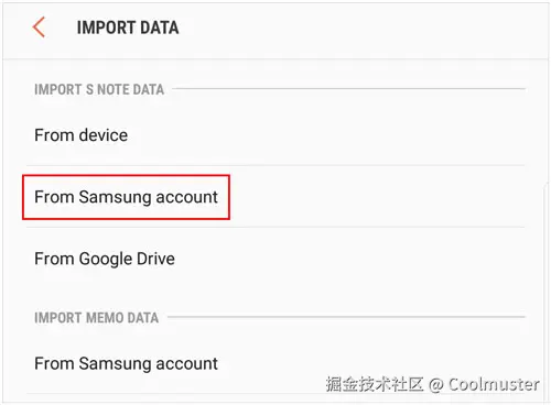 步骤4: 点击“导入数据”选项,然后点击“来自三星帐户”按钮。三星笔记应用程序将从三星云恢复您备份的三星笔记。
