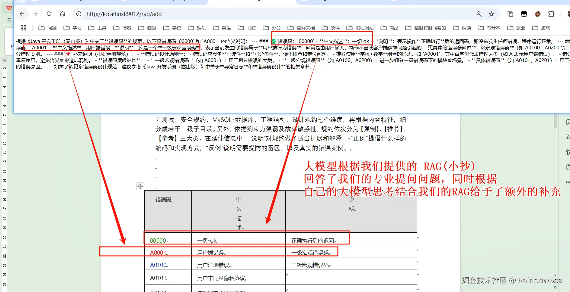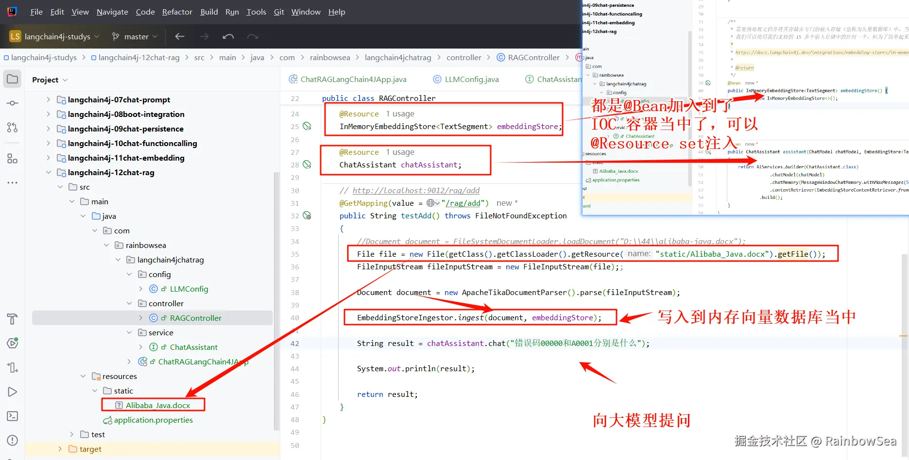 - 编写对外访问的 ctroller 层:将我们的将我们的 RAG(小抄(Alibaba Java 开发手册)) 信息存储到内存向量数据库当中,供大模型读取使用。再向大模型提问,大模型就会结合其中 Alibaba Java 开发手册当中的内容回答。