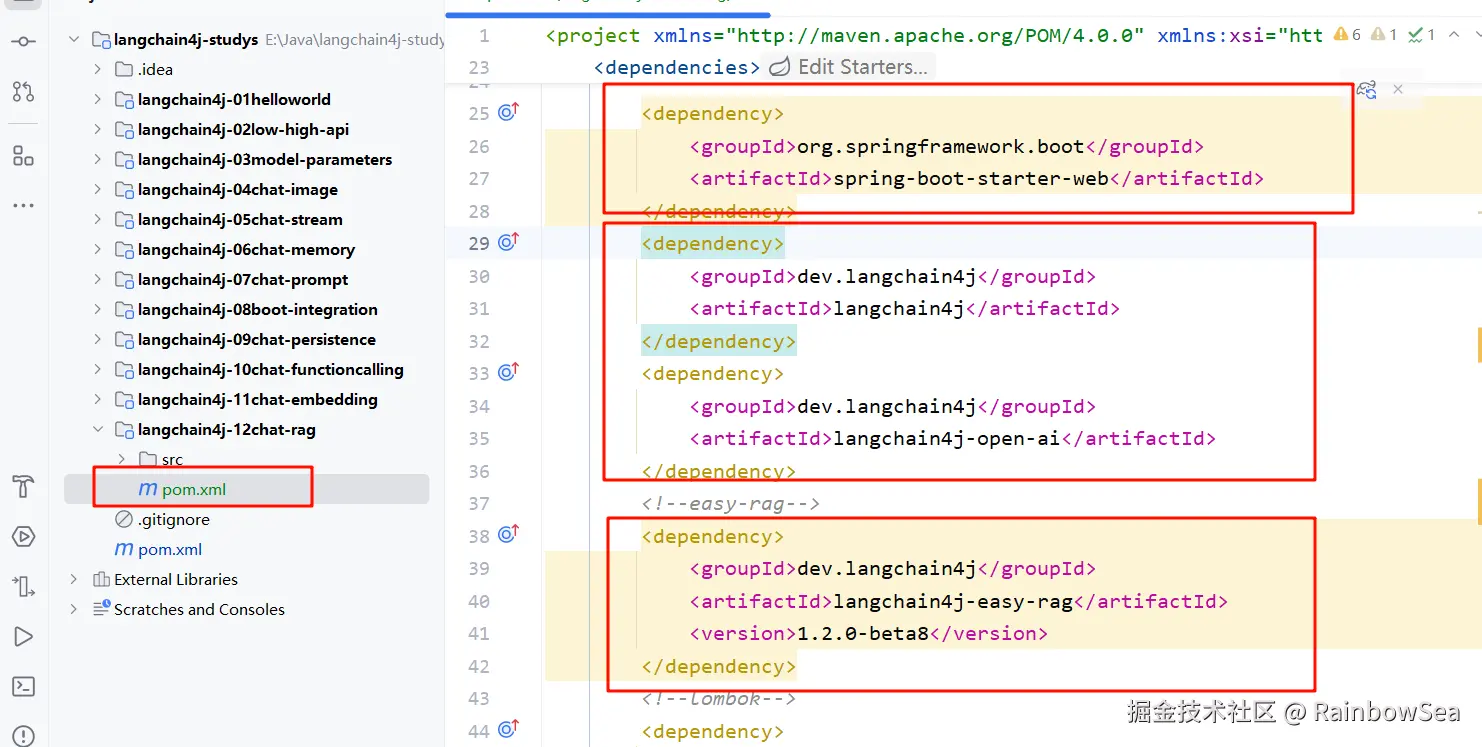 langchain4j-open-ai-spring-boot-starter,langchain4j-spring-boot-starter,同时我们加入我们的操作 RAG 的 jak 依赖。因为我们这里使用的是“内存的向量数据库”所以不需要额外的引入其他的向量数据库包。这里我们不指定版本,而是通过继承的 pom.xml 当中获取。_