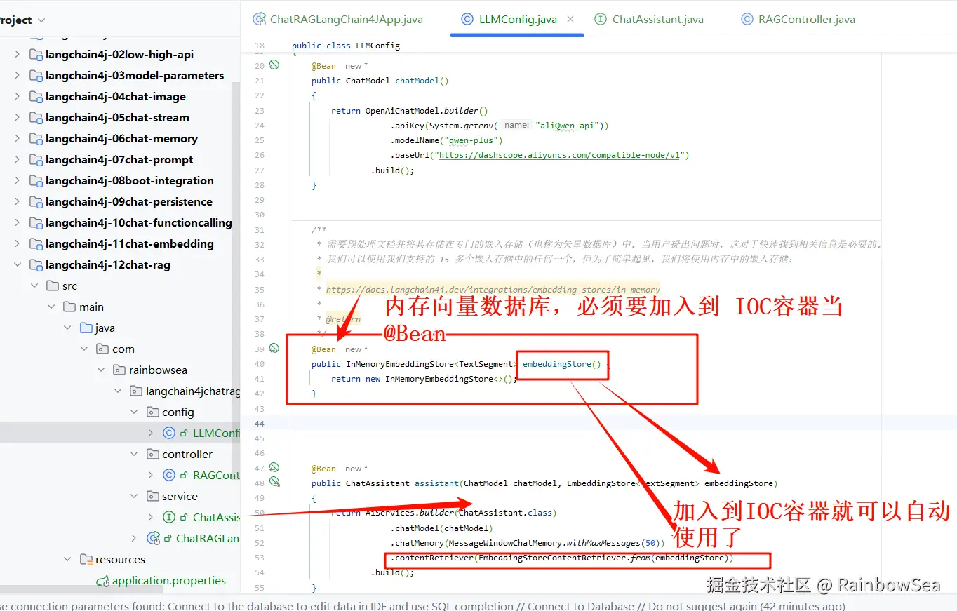 - 编写大模型三件套(大模型 key,大模型 name,大模型 url) 三件套的大模型配置类。同时也需要配置,我们的向量数据库(内存向量数据库),将我们的 RAG(小抄(Alibaba Java 开发手册)) 信息存储到内存向量数据库当中,供大模型读取使用。