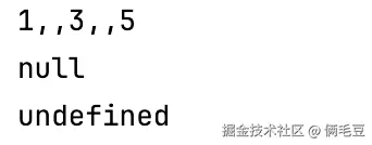 hilog.info(0x008666, '俩毛豆:testNullAndUndefind', "" + array); // 输出: [1,,3,,5]
