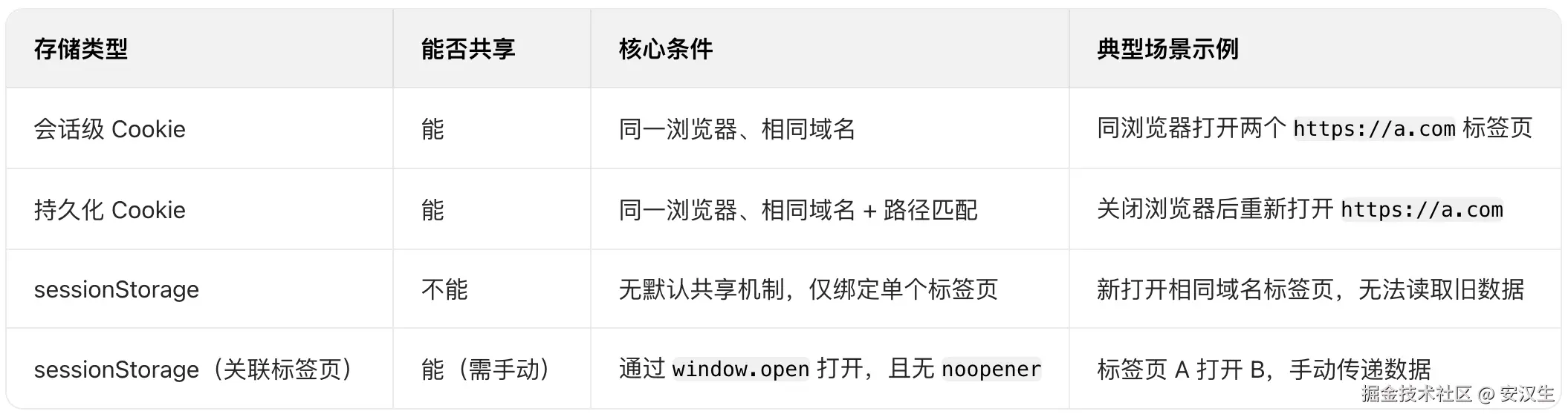 - SessionStorage “为单个标签页的临时会话存储数据”,其核心规则是 “数据与标签页强绑定”,即使是相同域名的不同标签页,默认也无法共享