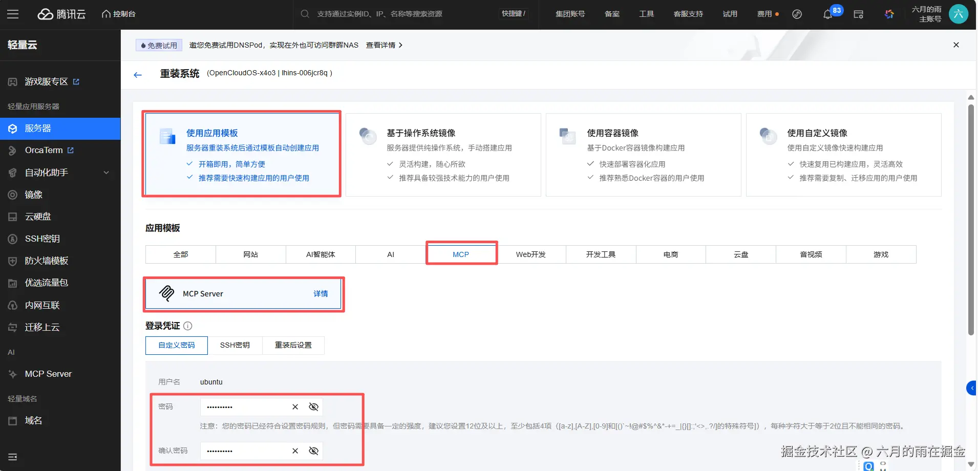 在重装系统页面选择【使用应用模版】-【MCP】-【MCP Server】输入服务器密码后勾选协议选择确定完成系统重装