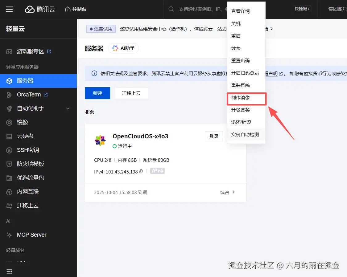 如果你之前已经购买过腾讯云轻量应用服务器,那么这里就可以直接通过重装系统的方式来重新创建MCP Server 模版系统。在重装系统之前,如果你当前的轻量应用服务器系统部署的应用后面还用的话,你可以选择先制作当前系统镜像后再重装系统。