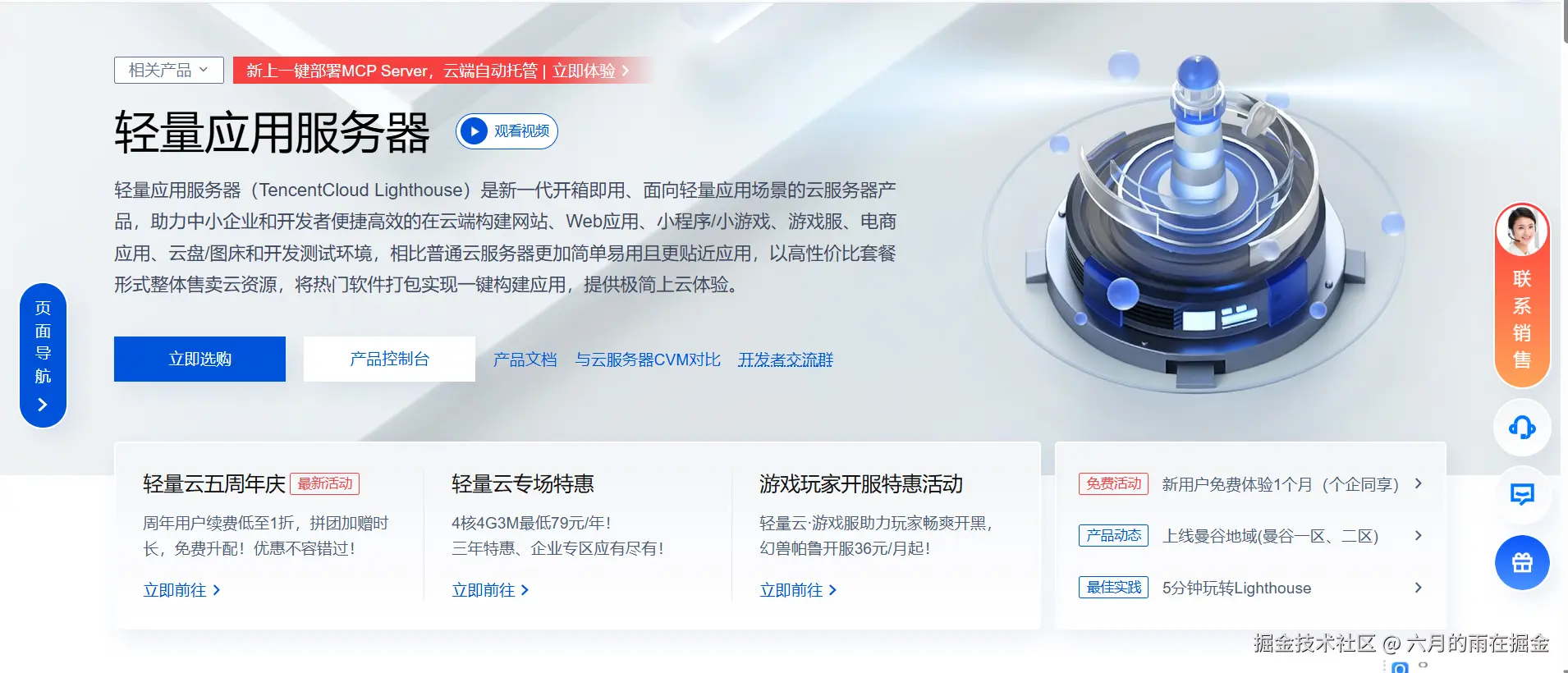 以下介绍是来自官网的介绍:轻量应用服务器(Tencent Cloud Lighthouse)是新一代开箱即用、面向轻量应用场景的云服务器产品,助力中小企业和开发者便捷高效的在云端构建网站、小程序/小游戏、电商、云盘/图床以及各类开发测试和学习环境,相比普通云服务器更加简单易用,提供高带宽流量包并以套餐形式整体售卖基础云资源,将热门开源软件融合打包实现一键构建应用,是您使用腾讯云的最佳入门途径。