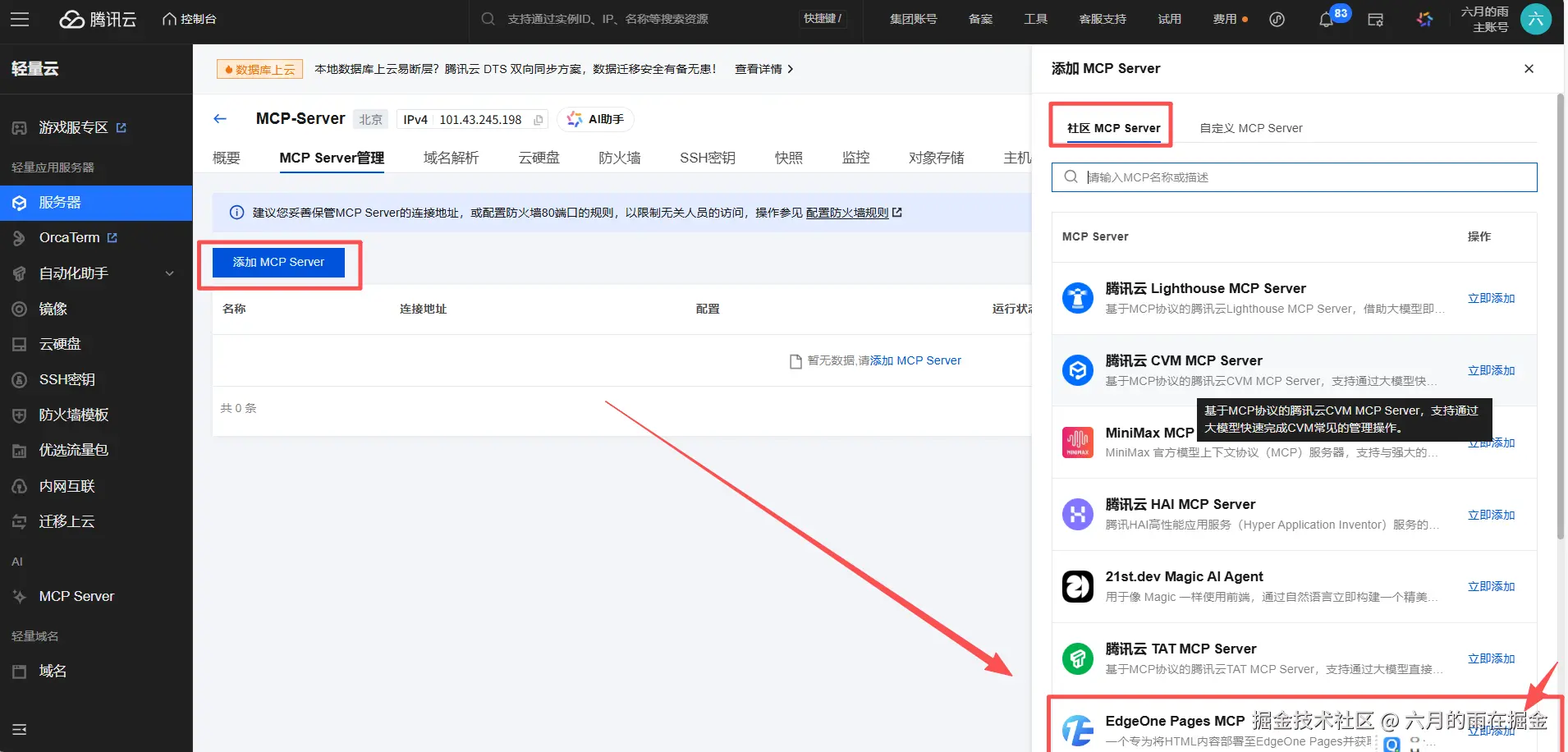 在轻量应用服务器控制台页面,选择【服务器】,点击进入服务器详情页,在详情页面选择 【MCP Server 管理】页签,进入 MCP Server 详情页,点击【添加MCP Server】