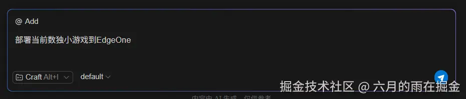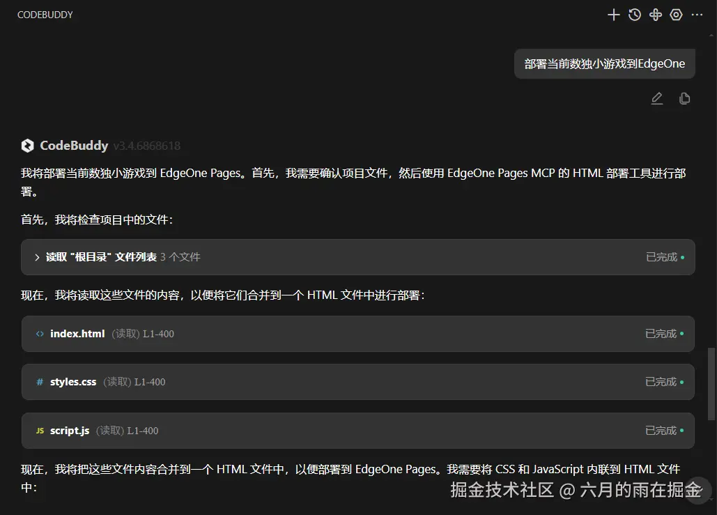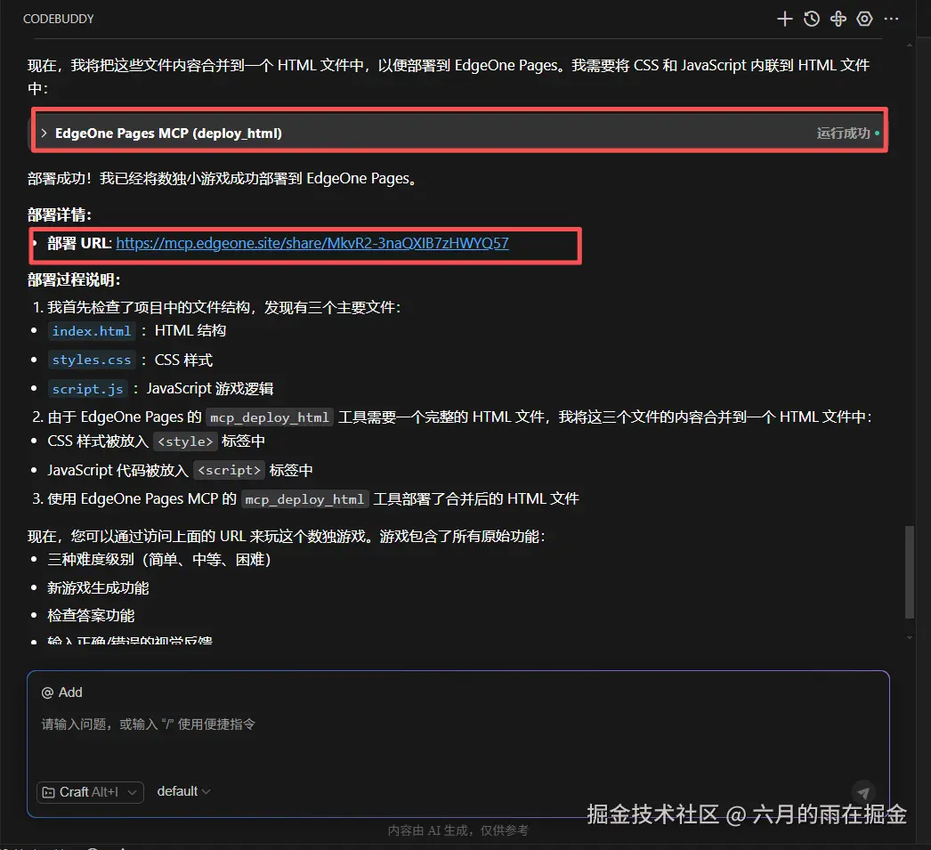 下面我们来让我们的CodeBuddy 部署我们的数独小游戏到EdgeOne,在AI 对话框中输入