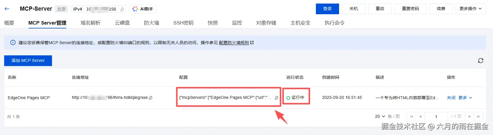 等待我们的EdgeOne Pages MCP 部署成功后,我们可以在 MCP Server 管理页面看到具体的运行状态