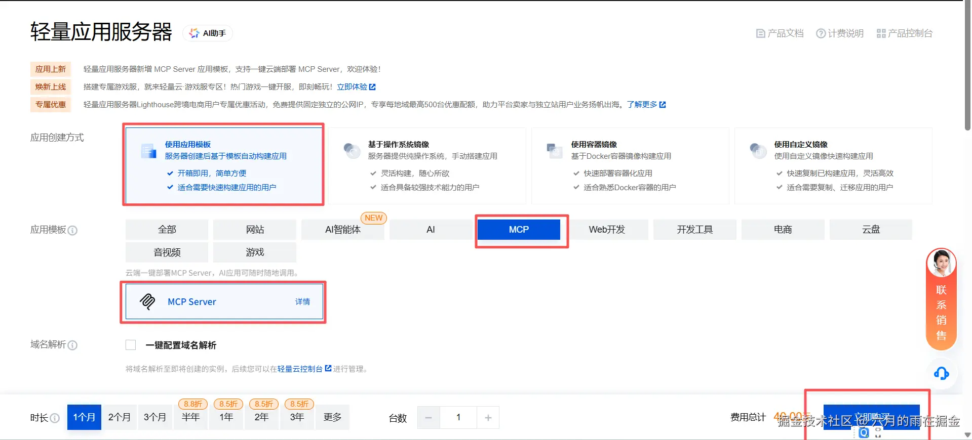 在打开的轻量应用服务器页面选择【使用应用模版】-【MCP】-【MCP Server】,其他的默认即可,最后勾选协议,点击【立即购买】创建轻量应用服务器