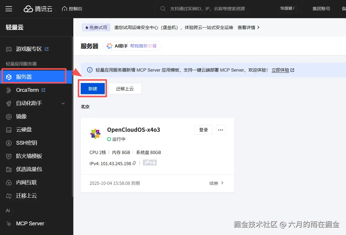 如果你之前没有购买过轻量应用服务器,那么可以通过下面操作购买云服务器。这里我简单讲一下如何购买腾讯云轻量应用服务器。打开腾讯云轻量应用服务器控制台:console.cloud.tencent.com/lighthouse/… 切换到菜单【服务器】-【新建】