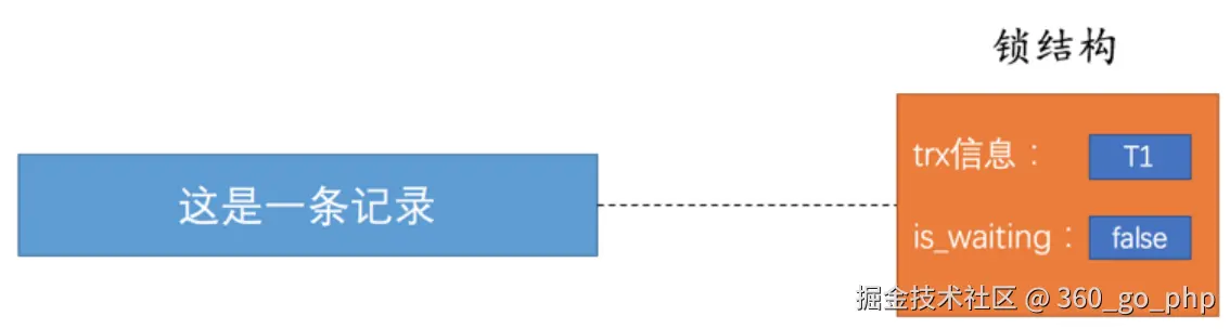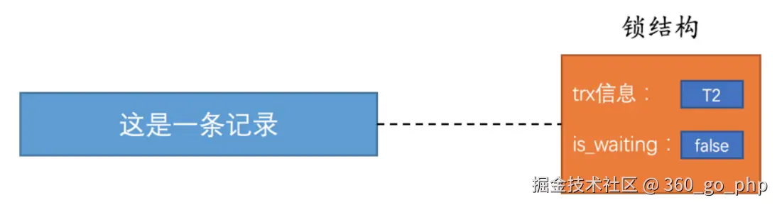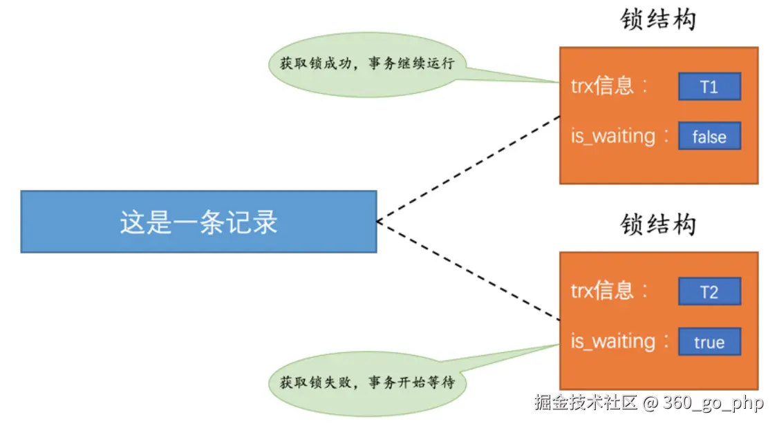 在事务 T1 提交之前,另一个事务 T2 也想对该记录做改动,那么先去看看有没有 锁结构 与这条记录关联,发现有一个 锁结构 与之关联后,然后也生成了一个 锁结构 与这条记录关联,不过 锁结构 的is_waiting 属性值为 true ,表示当前事务需要等待,我们把这个场景就称之为获取锁失败,或者加锁失败,或者没有成功的获取到锁,画个图表示就是这样: