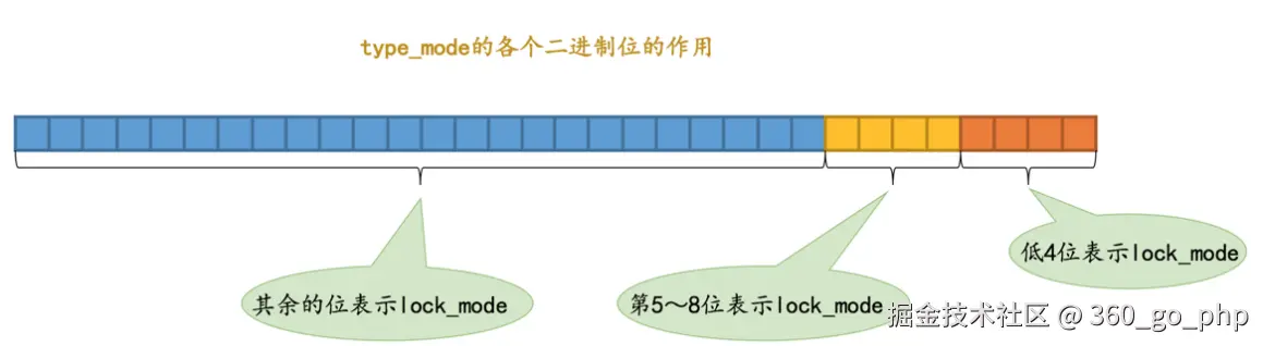 这是一个32位的数,被分成了 lock_mode 、 lock_type 和 rec_lock_type 三个部分,如图所示: