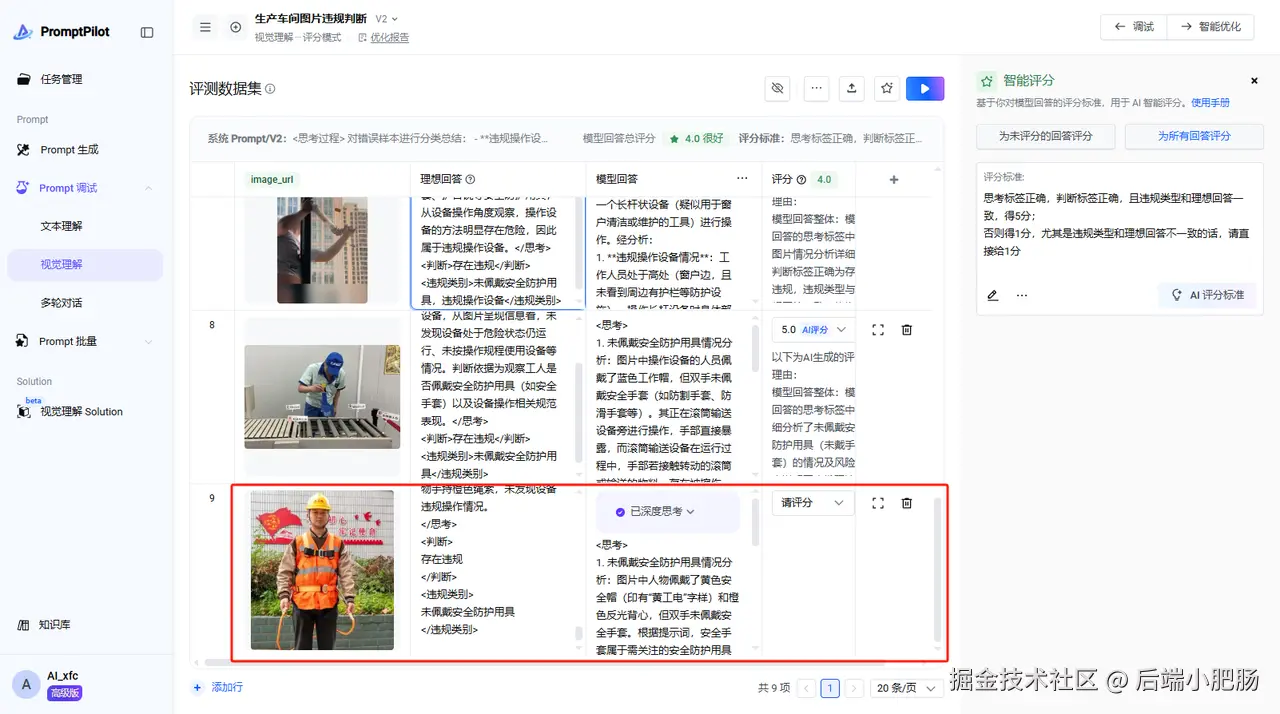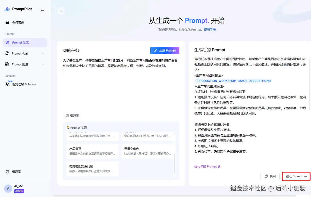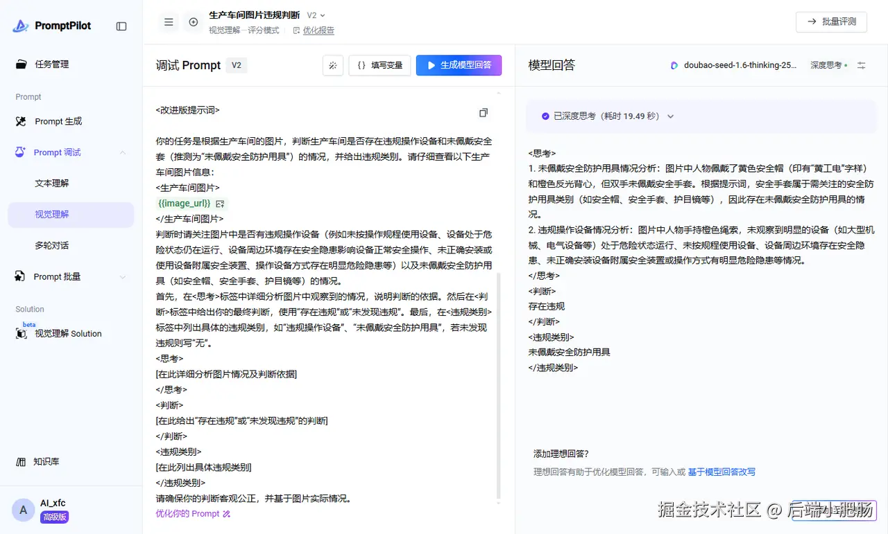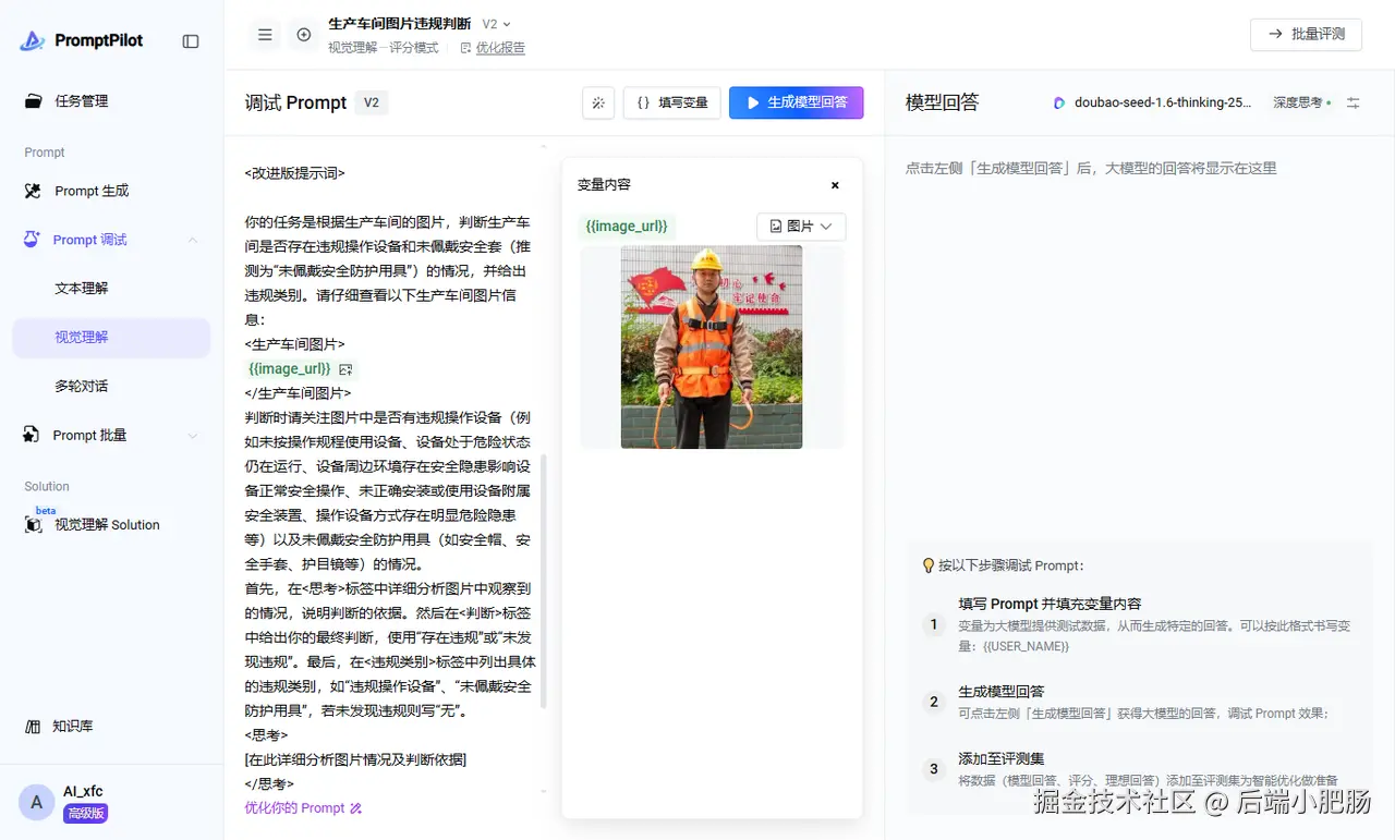 理论的震撼终究要靠实践来消化。在实操环节,我选择了一个工业领域的经典场景: “质检巡检——图片理解” ,目标是让AI模型能够根据生产车间的图片,判断是否存在违规操作。 提示词我是基于Prompt生成模块来语义生成的,纯大白话输入了。