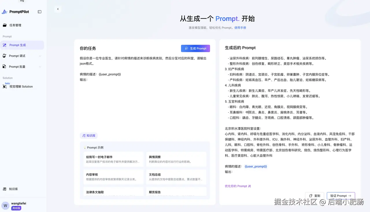 这个案例的巧妙之处在于将提示词的生成与精准的外部知识(医院科室介绍)进行了无缝结合。当用户输入病情描述时,PromptPilot不仅能生成一个高质量的问询Prompt,还能自动关联知识库,为用户推荐最匹配的科室。