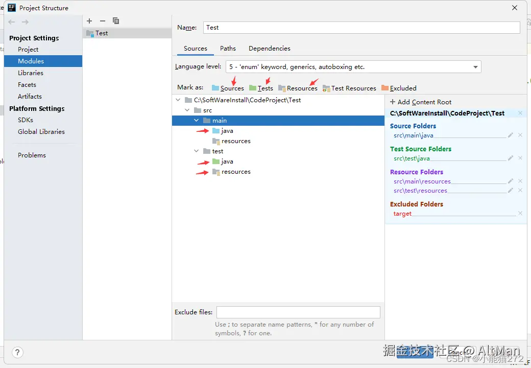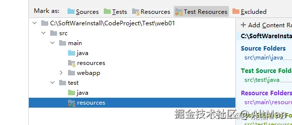 - 在main包下创建java包,在src目录下创建test包,在test包下创建java、resources包