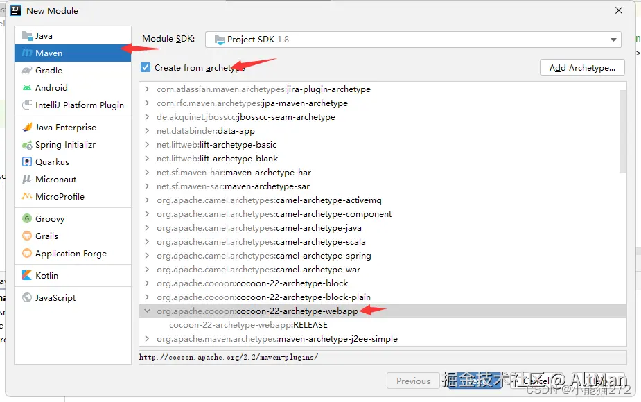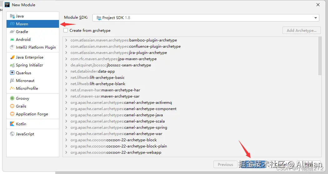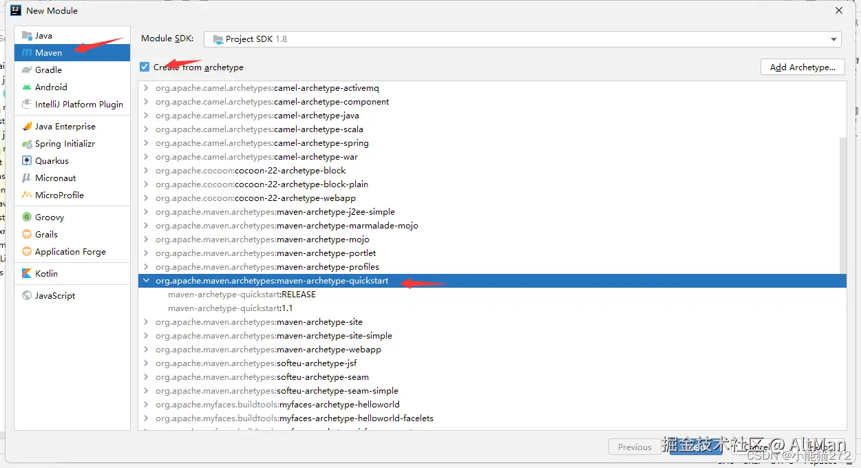 - 选择模块,新建一个maven模块,勾选Create From archetype(使用模板),然后选择quickstart