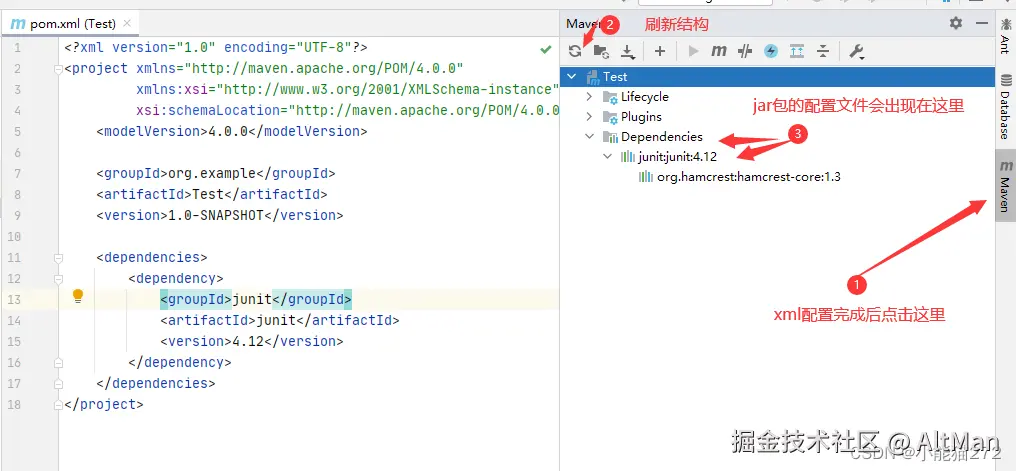 - 进入pom.xml配置文件,打上需要用的jar包,写完之后需要点击右边的刷新