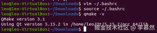 这一步是为了能让 linuxdeployqt 工具识别到 Qt 的环境。编辑 bashrc 文件