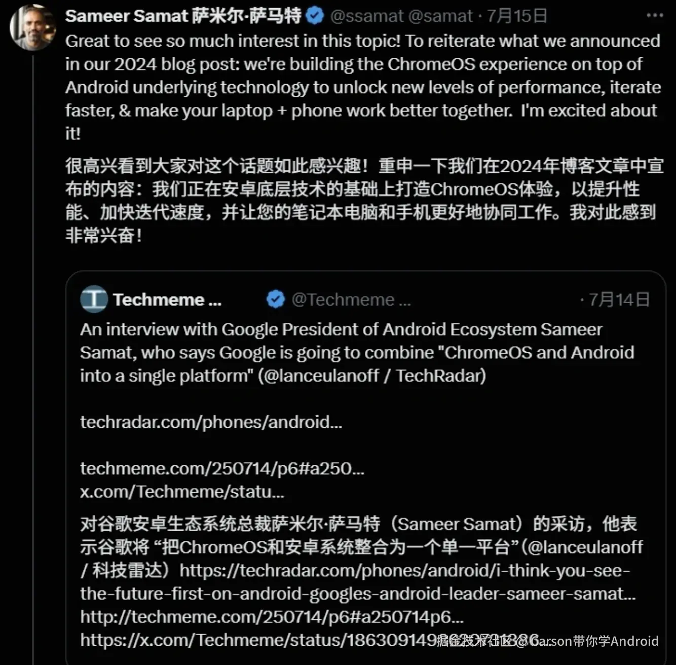 谷歌Android系统总裁Samat首次公开确认:公司计划将Chrome OS和Android操作系统合并为单一平台。