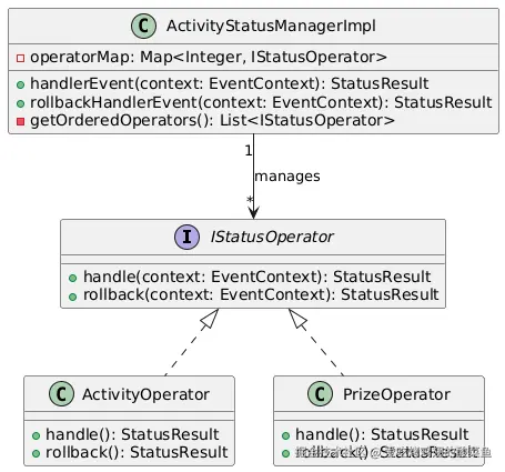 状态引擎的核心逻辑集中在 ActivityStatusManagerImpl 的事件处理方法中,代码通过getOrderedOperators 确保策略按预设顺序执行,每个 operator 仅关注自身逻辑,管理器无需感知具体实现,实现了“控制反转”。为应对流程中断场景,系统设计了反向责任链回滚回滚时按策略执行的逆序调用 rollback 方法,确保数据一致性(如先回滚奖品发放,再取消活动状态变更)。: