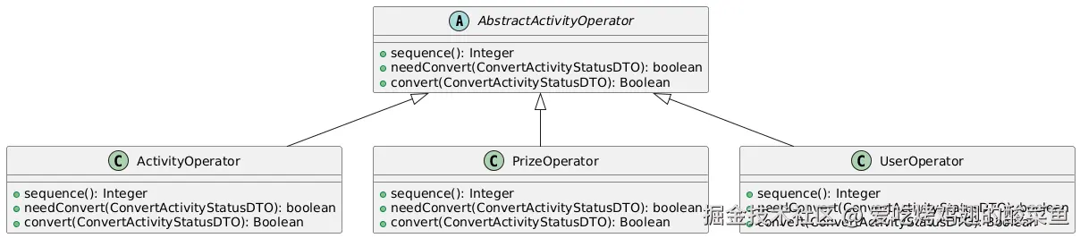 在抽奖系统设计中,我们把状态转换逻辑拆分为独立策略。每个 Operator 类(如 ActivityOperator 处理活动状态、PrizeOperator 管理奖品状态、UserOperator 控制用户参与状态)都是具体策略,它们共同继承 AbstractActivityOperator 抽象类,实现 convert(执行转换)和 needConvert(判断是否需要转换)方法。这种设计的妙处在于:新增状态转换规则时,只需添加新的 Operator 类,完全不用修改已有代码,完美契合开闭原则。