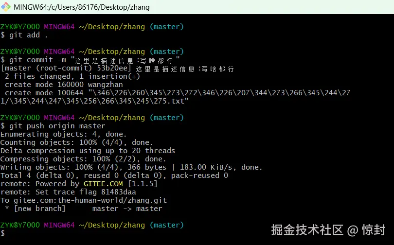 复制SSH地址,在git上输入git clone git@gitee.com:the-human-world/zhang.git命令,可以看到桌面上有一个文件夹,就是远程仓库。