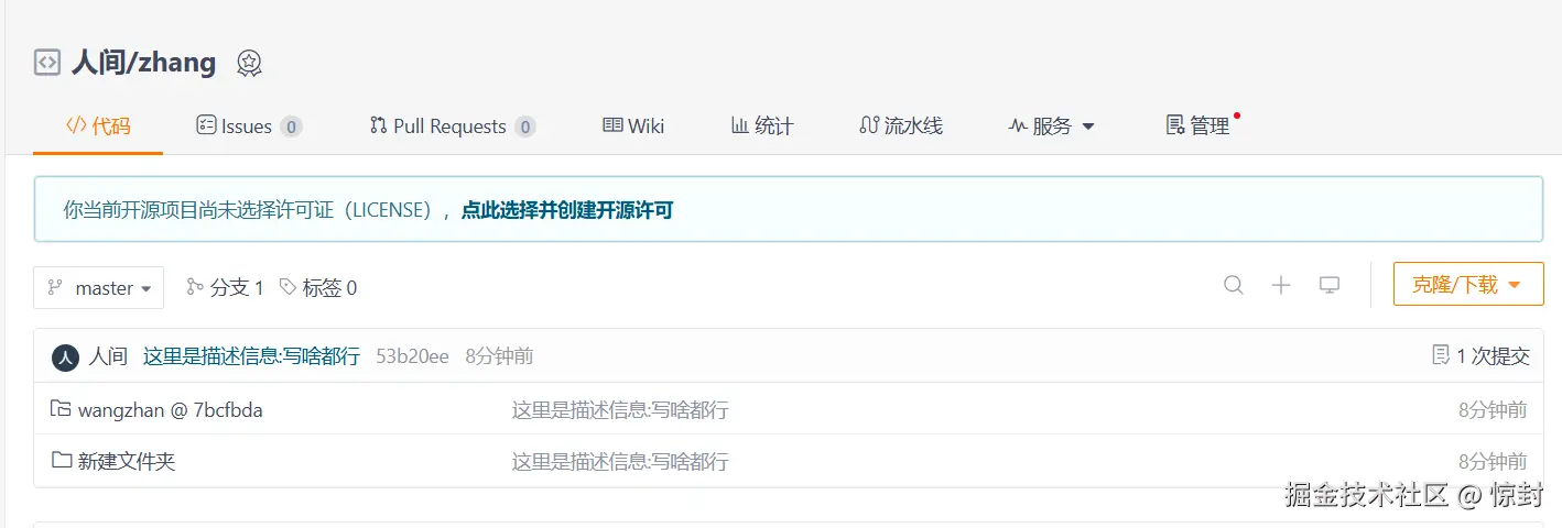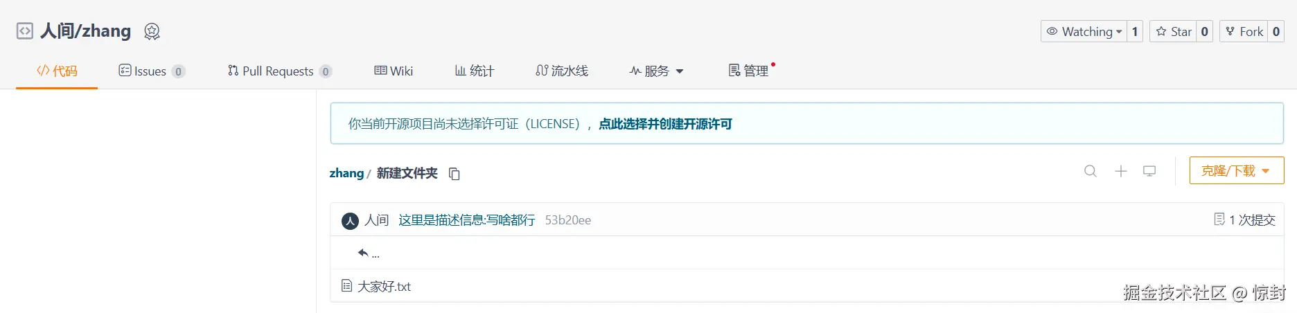 创建后需要配置一下,有提示命令,在git上输入两行命令git config --global user.name "人间"和git config --globalthe-human-world@user.noreply.gitee.com"就行了。