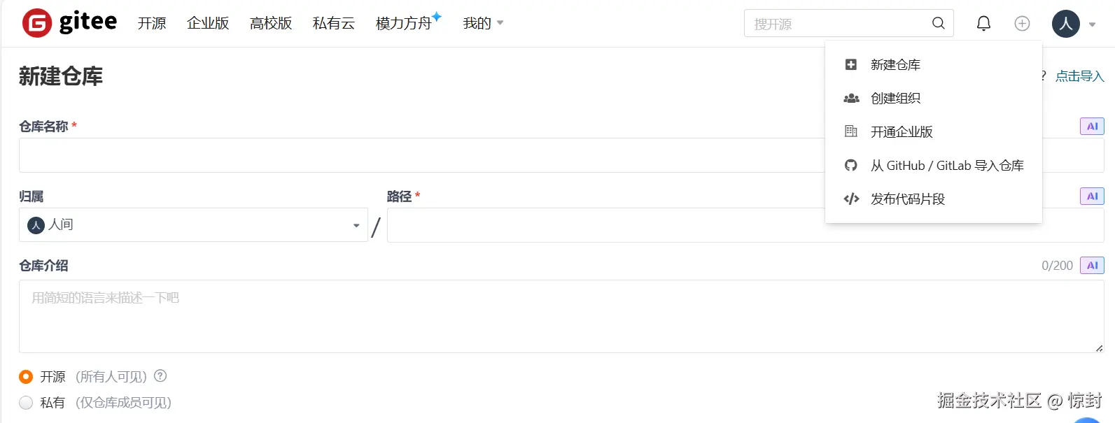 在gitee上新建一个仓库,随便起一个仓库名,选择开源,其他默认就行。
