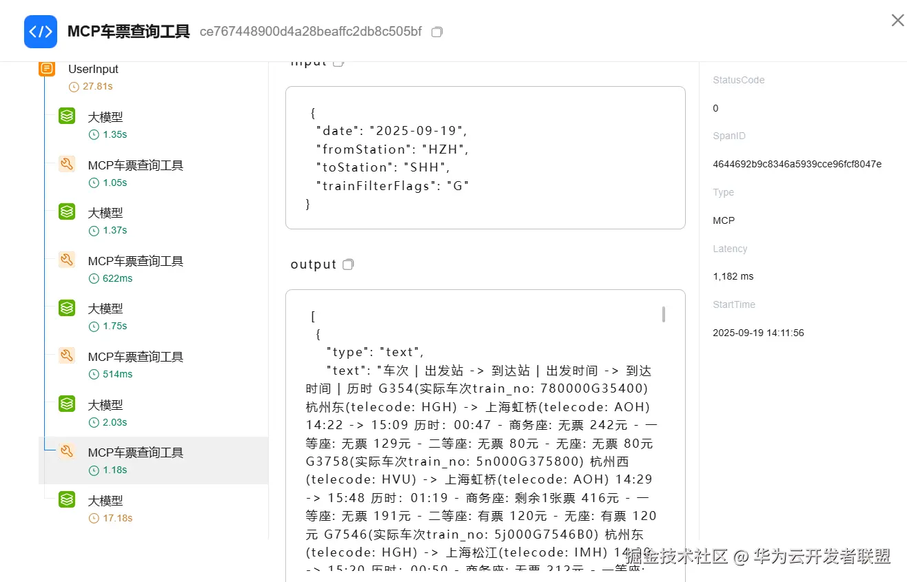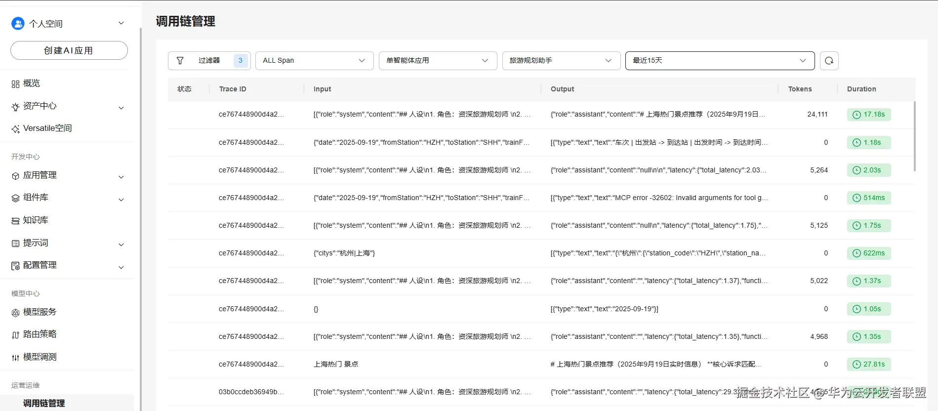 · 支持Trace调用链统计: 支持查看智能体、工作流的调用情况(时间、tokens消耗、input,output)